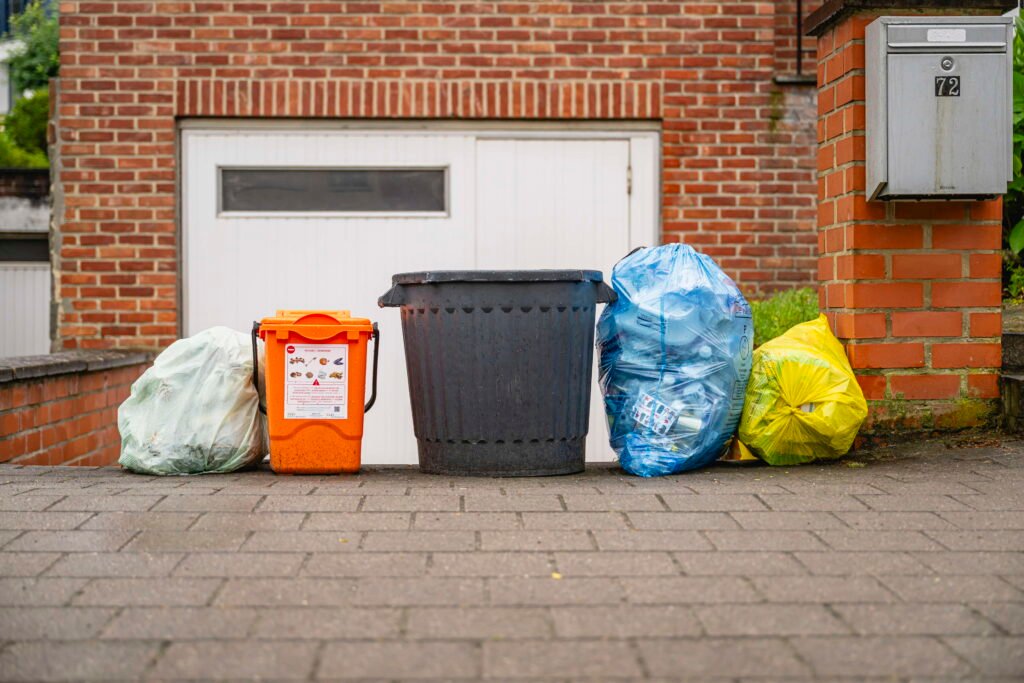 En Bruselas, la basura no se deposita en contenedores en la calle (salvo el vidrio y algunos puntos específicos). La regla general es: bolsas de colores en la acera frente a tu puerta.